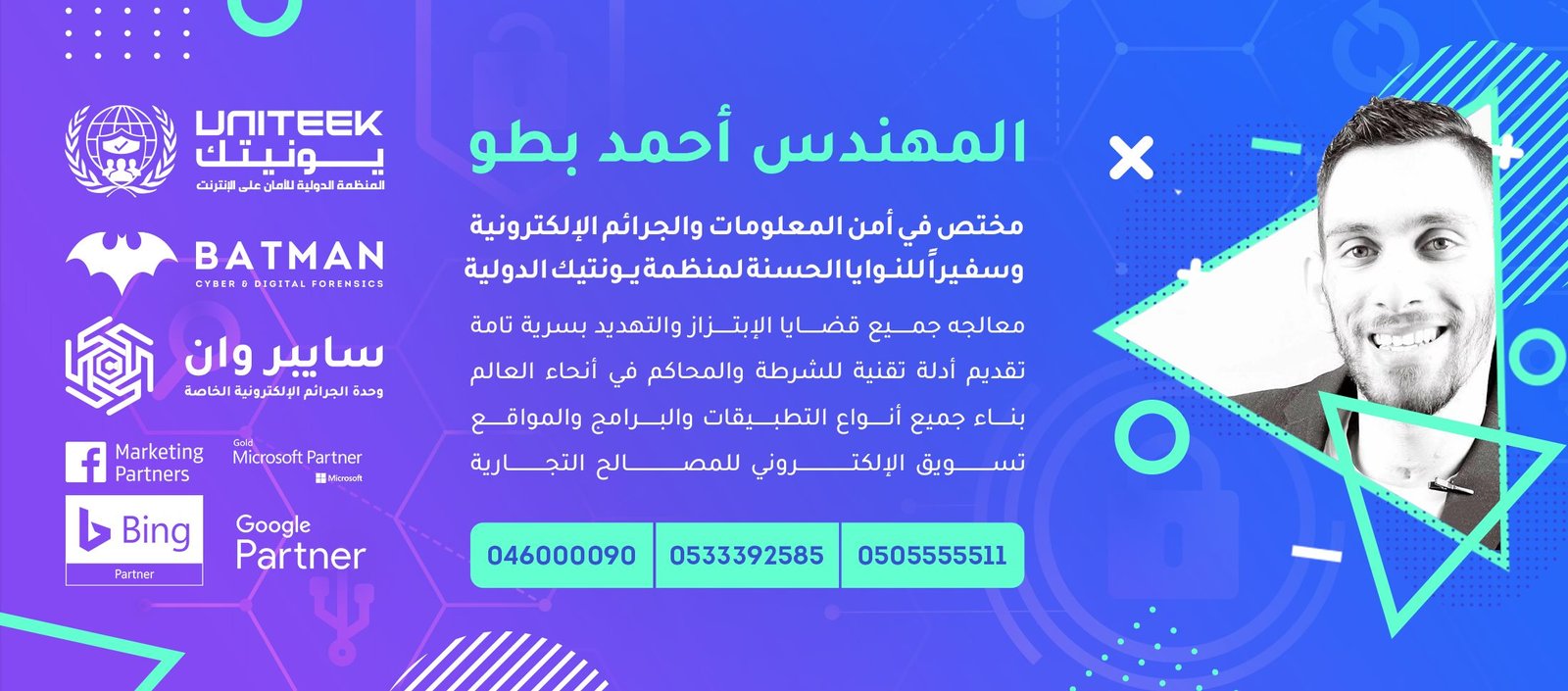 المهندس احمد بطو مختص أمن المعلومات والجرائم الإلكترونية وسفيراً لنوايا الحسنة لمنظمة يونتيك الدولية للأمان على الإنترنت.